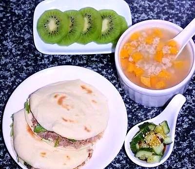 肉夹馍配红薯麦片粥,再佐以拍黄瓜小菜和猕猴桃,营养又美味。