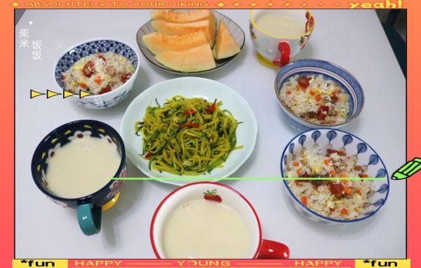 周三早餐:黄豆米糊、腊肠炒饭、辣炒南瓜丝、哈密瓜。黄豆米糊的制作相当简便,只需将黄豆与小米一同放入破壁机,利用豆浆模式即可轻松打成细腻香浓的米糊。早餐时享用一杯,营养价值满满。