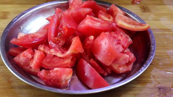 3、接下来处理一下西红柿,将西红柿洗净,然后对半切开,去掉里面的蒂。再给它切成小块,小块的形状可以根据自己的喜好来进行确定,大小也是要根据自己的喜好来进行确定。切好之后咱们将其放到一个盘中备用。