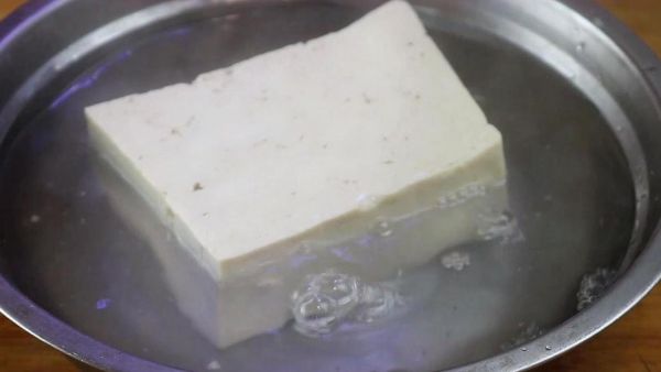 2、咱们先来处理一下豆腐,把咱们准备好的豆腐放到一个小盆中,然后向豆腐中倒入滚烫的开水,倒进开水之后再放一点食用盐进去。这样不仅可以增加豆腐的底味,而且还可以达到去除豆腐中豆腥味的目的,使做出来的豆腐更加滑嫩爽口,更加好吃。时间大概在五分钟左右。