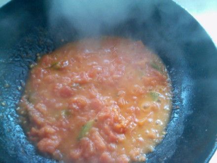4.炒锅烧热,倒入食用油。油热后放入花椒爆香后将花椒捞出(不喜欢花椒味道的可以省略),爆香葱姜,倒入番茄,炒至糊状,加入热水!