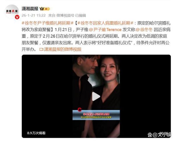 1月21日,演员尹子维在微博发文,宣布与未婚妻徐冬冬原定于2月26日在哈尔滨举行的盛大婚礼仪式将延期。原因无关感情生变,也非工作冲突,而是因为徐冬冬一位从小抚养她长大的至亲长辈病情危急,情况不乐观。