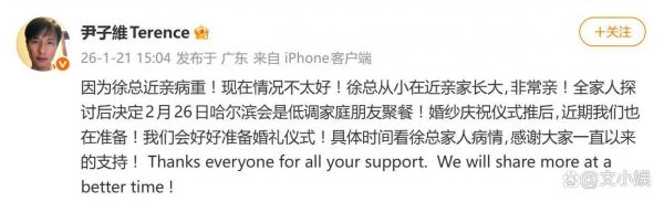 尹子维发文称徐冬冬因近亲病重,婚礼仪式将延期