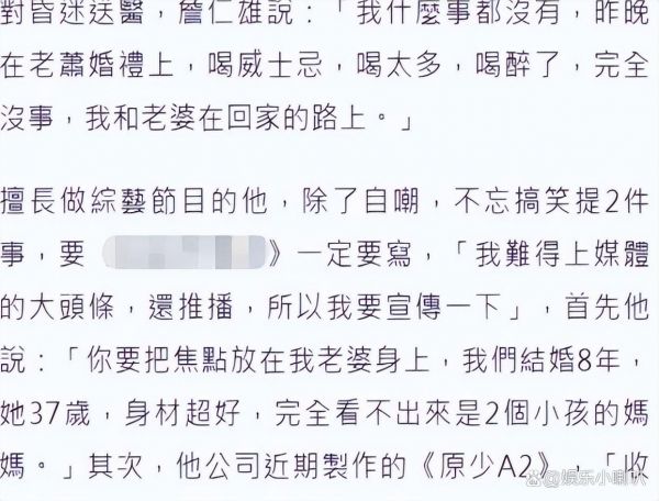 詹仁雄苏醒后,第一时间向大家报了平安,并表示自己没事,只是喝多了威士忌,闹了个不小的笑话。他还幽默地提到,难得上了头条,正好趁机介绍一下自己的妻子。詹仁雄和妻子结婚已有8年,妻子比他小16岁,尽管已经生了两个孩子,但身材依然保持得很好,詹仁雄对妻子的赞美之词溢于言表。