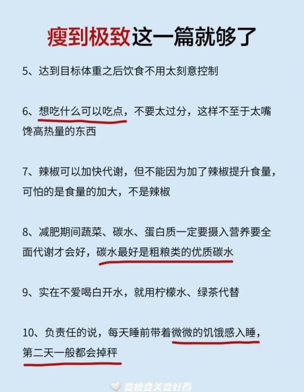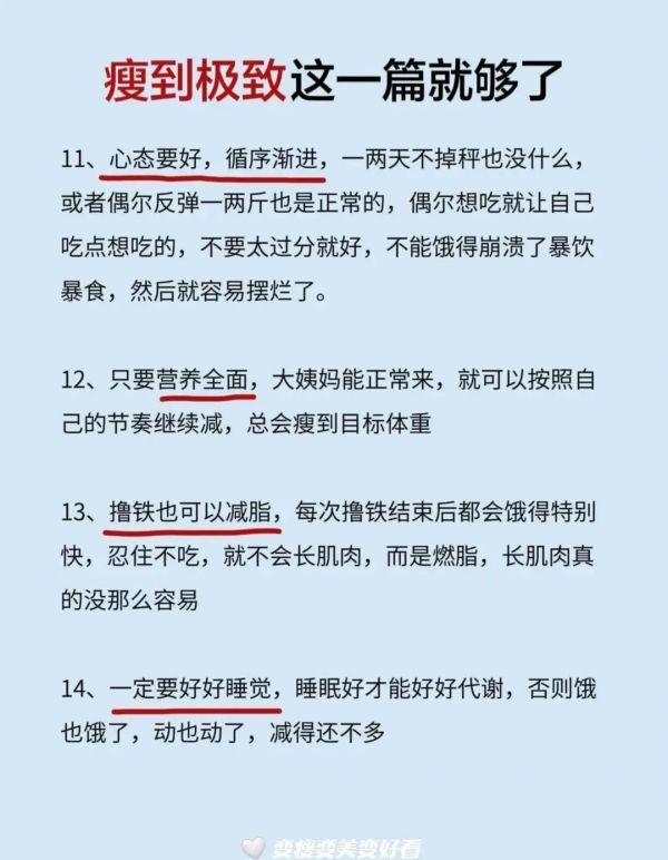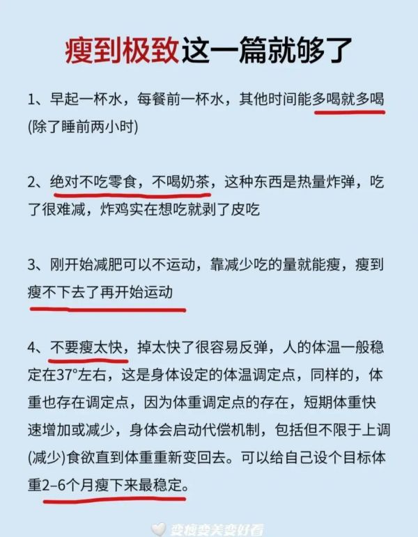 【瘦到极致】——从容减肥从容瘦想要减肥,却苦于找不到合适的方法?不用担心!今天我们为你带来一份高效又健康的减肥方案,让你从容瘦下来。首先,早起一杯水,每餐前一杯水,其他时间能多喝就多喝。水不仅能帮助消化,还能增加饱腹感,让你在饮食上更加有控制力。其次,绝对不吃零食不喝奶茶。这些热量炸弹会让你的减肥计划付之东流。如果实在忍不住想吃炸鸡,那就剥了皮再享用吧。刚开始减肥可以不运动,靠减少食量就能瘦。只有当你瘦到瘦不下去的地步,才需要开始运动。瘦得太快很容易反弹,所以要稳扎稳打,给自己设定一个2-6个月的目标体重,这样能够最稳定地瘦下来。达到目标体重之后,不用太过刻意地控制饮食。