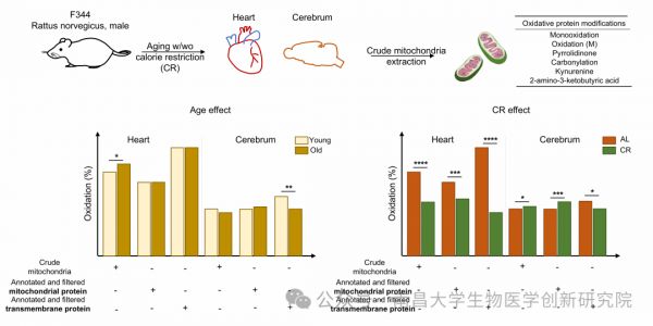 研究团队对年轻(6.5个月)与老年(27个月)大鼠的心脏和大脑线粒体蛋白质进行了多种氧化翻译后修饰(oxPTMs)的系统定量分析,并考察了短期及终身热量限制干预的效果。与MFRTA理论预期相反,该研究未发现衰老导致心脏或大脑线粒体蛋白质氧化水平显著升高。热量限制能显著降低心脏中线粒体蛋白质和跨膜蛋白质的整体氧化修饰水平,对跨膜蛋白的影响尤其显著。在大脑中,热量限制同样减少了跨膜蛋白质的氧化,然而线粒体蛋白质的氧化水平却显著增加。上述研究提示热量限制可能通过诱导大脑产生轻度氧化应激,从而激活保护性信号通路,发挥其延长健康寿命的作用。