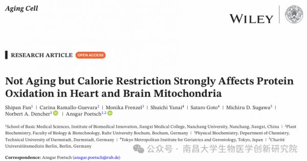 2026年1月,我院/基础医学院Ansgar Poetsch教授团队联合德国波鸿鲁尔大学、达姆施塔特工业大学、日本东京都健康长寿医疗中心、德国柏林夏里特医学院等科研机构,在衰老研究领域知名期刊《Aging Cell》上发表了题为“Not Aging but Calorie Restriction Strongly Affects Protein Oxidation in Heart and Brain Mitochondria”的研究论文,该研究通过无偏倚蛋白质组学分析,首次在多组织、多修饰层面上系统揭示了热量限制对线粒体蛋白质氧化修饰具有显著且组织特异性的调控作用。