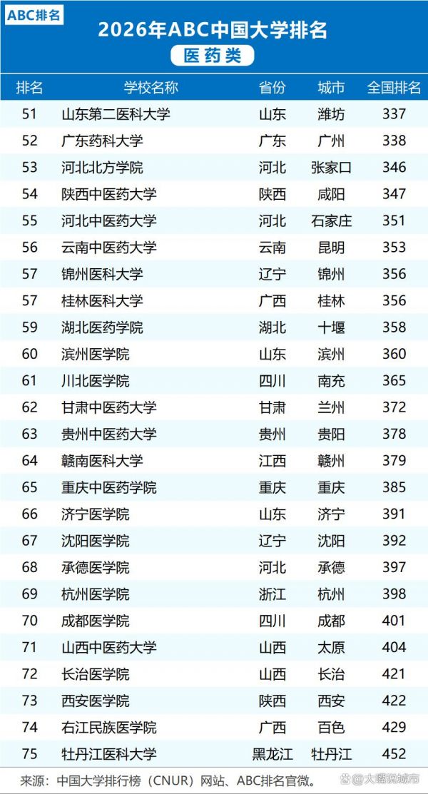 榜单显示,顶尖医药类院校的排名竞争激烈,位列前十的院校及其在全国总榜中的位次如下: