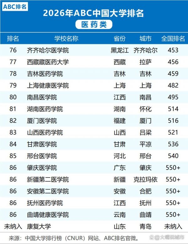根据中国大学排行榜(CNUR)网站于2026年1月4日发布的《2026年ABC中国大学排名》,我国医药类高等教育机构在综合竞争力方面展现出清晰的梯队格局。本次排名共评估了全国865所公办普通本科院校,其中医药类院校有90所上榜,较上年增加了3所,反映了该领域持续稳定的发展态势。