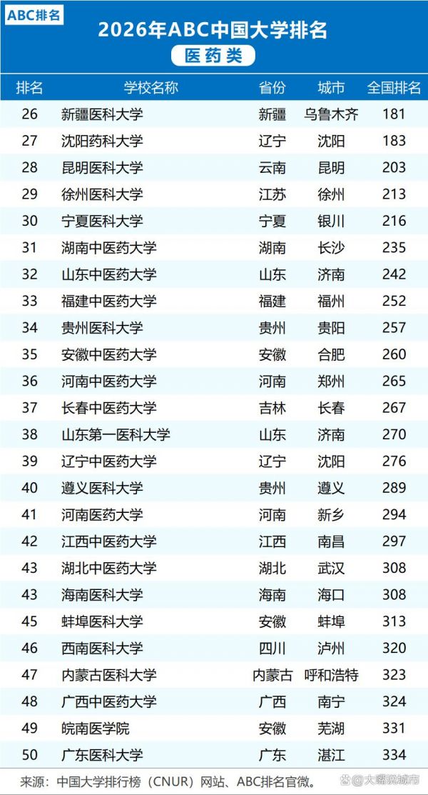 综上所述,2026年ABC中国医药类大学排名清晰地呈现了“顶尖引领、集群发展”的格局。以北京协和医学院为龙头的一批高水平院校稳居前列,同时大量院校分布于全国各地,共同支撑起我国医药卫生人才培养和科学研究的基石。该排名为考生择校、学界研究及公众了解医药类高等教育现状提供了重要且宏观的参考依据。