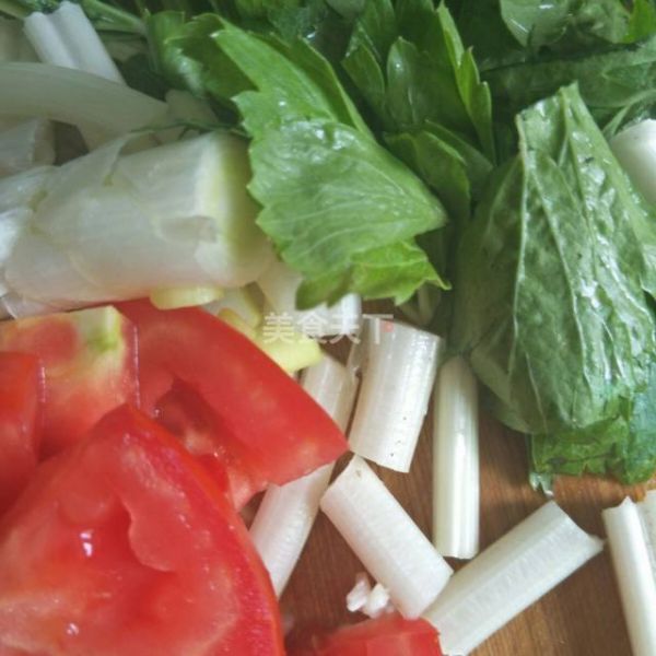 第4步、半锅清水烧开这个空挡切好所有配菜。大葱芹菜梗切段西红柿切片芹菜叶和香菜叶切碎备用