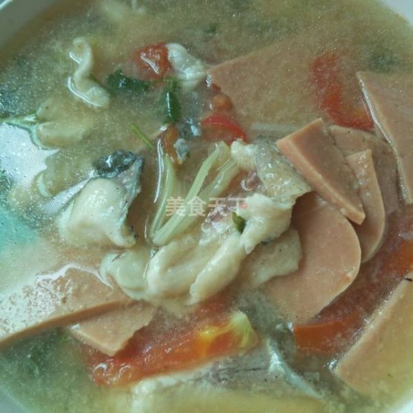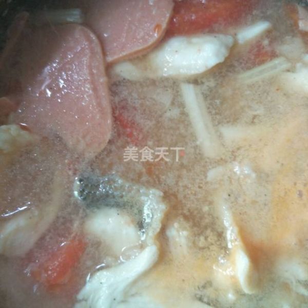鱼片汤是一道家常菜这份汤里面加了小孩儿爱吃的火腿肠和西红柿。鱼片好吃,又嫩又滑颜色搭配均匀,好看,营养价值也非常的丰富。