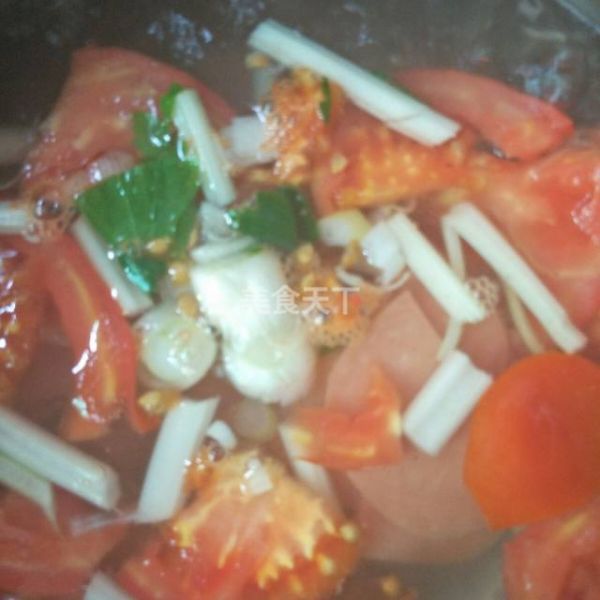 第5步、水开以后加大葱和芹菜根和火腿肠和西红柿熬制。