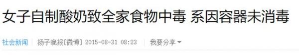 2018年,厦门的姚女士自制酸奶时杀菌不严,导致全家食用后腹泻,后经医院化验检查,也是诊断为食物中毒。据悉,这已不是姚女士第一次自制酸奶,她怎么也想不到会这么严重。
