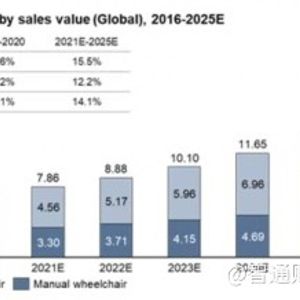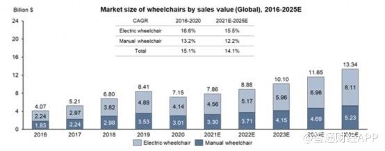 老年人口的持续增长,使得养老产业的发展尤为迫切,也无疑将推动对医疗辅助设备(如轮椅)的需求稳定高增。根据弗若斯特沙利文数据,2016年至2020年间,全球轮椅总销售额由约40.7亿美元上升至约71.5亿美元,复合年增长率为16.6%;到2025年底,全球轮椅的总销售额预计将达到约133.4亿美元,2021年至2025年的复合年增长率为14.1%。