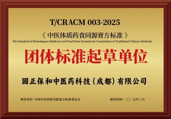 2025年3月17日,由中国中医药研究促进会发布,中国中医科学院中药研究所、固正保和中医医学研究院牵头,联合成都双流固正保和互联网医院,成都武侯固正保和堂中医诊所,固正保和中医药科技(成都)有限公司,南京九虎古方中医研究院有限公司,南京九虎古方医疗科技有限公司建邺中医诊所共同制定的《中医体质药食同源膏方标准》(T/CRACM0003--2025)经国家标准化管理委员会审核通过,正式发布实施。