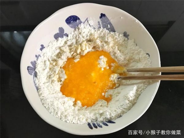 2、将面粉放到容器中,准备好的白砂糖倒入碗中搅拌均匀,然后将鸡蛋打破倒入面粉当中,用筷子将鸡蛋和面粉搅拌均匀,然后将准备好的橙汁倒入面粉中,继续用筷子搅拌均匀,最好搅拌成浓稠的流线面糊状态即可。