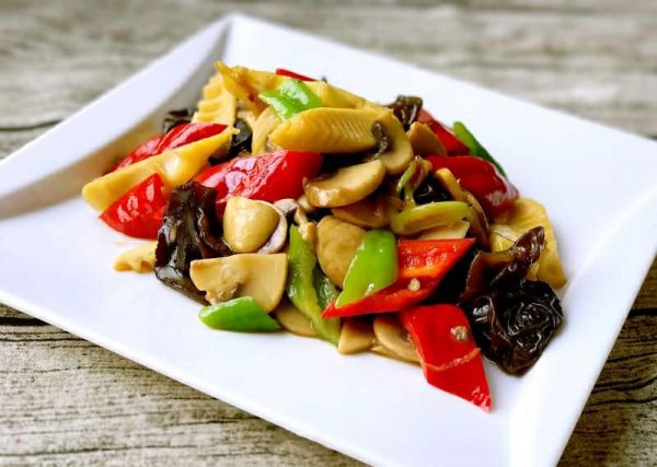 材料:口蘑3个、冬笋1根、青红椒各半、黑木耳少许、姜、水淀粉