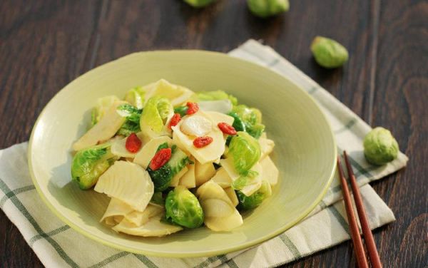 材料:冬笋1个、抱子甘蓝1碗、姜末、枸杞
