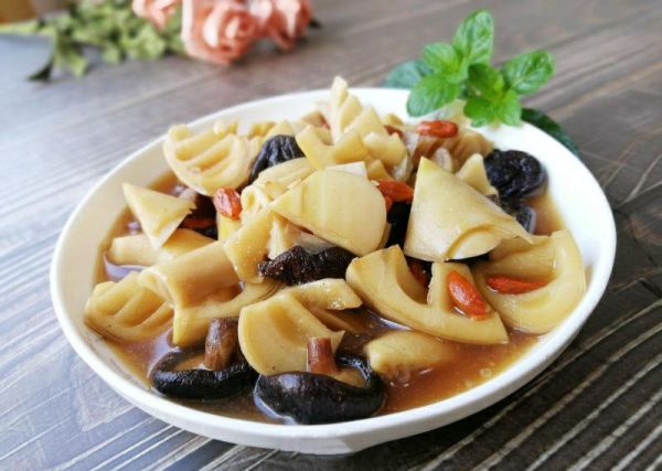 材料:冬笋、干冬菇、姜、枸杞、淀粉、生抽、白胡椒粉