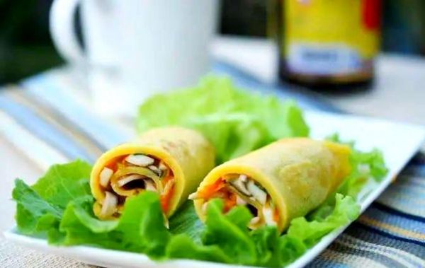 胡萝卜、金针菇与奶酪一起包裹在蛋饼中,口味香浓,提供丰富的营养。材料:胡萝卜、金针菇、韭菜、香葱、鸡蛋、奶酪片、培根。制作步骤:将胡萝卜、韭菜和金针菇分别切成细丝和段状。打撒鸡蛋,在平底锅上摊成薄薄的蛋饼。将奶酪片和培根片铺在蛋饼上,再铺上切好的胡萝卜丝、韭菜和金针菇,然后小心地卷成卷。使用香葱或者烫软的整根韭菜将蛋皮卷紧紧困扎,然后放入微波炉中,用光波功能烤制2分钟,直至奶酪完全糊化。最后取出装盘即可享用。