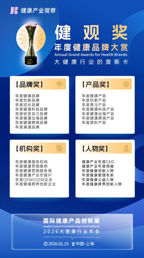 当健康消费需求持续升级,当创新成为企业破圈核心密码,你需要一个权威平台让实力被看见 —— 由知名行业媒体《健康产业观察》发起的【2026 健观奖・年度健康品牌大赏】申报通道正式开启!更重磅的是:健观奖颁奖典礼定于 2026 年 1 月 15 日在上海举办,与 “2026 大健康行业年会”“国际健康产品创新展(HPIE健观展)” 同期联动,一次参与即可同步斩获荣誉、对接产业链资源!
