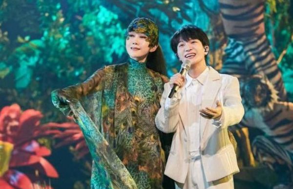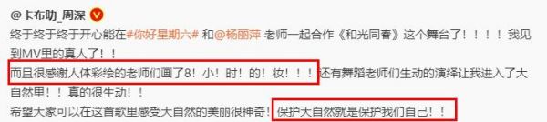 据悉,此次杨丽萍与周深的首次同台演出,目的是呼吁大家保护生物多样性。舞台上的人体彩绘的老师们画了八个小时的妆,才能有如此生动的场景再现,让人仿佛置身于世外桃源之中。