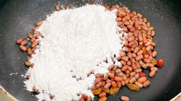 3、在一个大盆里,倒入糯米粉。把温热的、浓稠的红豆沙(注意不是滚烫的)倒入糯米粉中。用筷子或刮刀开始搅拌。 把洗干净的葡萄干、剪成小粒的红枣(去核!)也一起倒进去。
