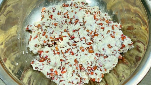 4、趁温热,下手揉!把红豆沙、糯米粉、果干充分揉合在一起。如果觉得太干难以成团,可以极其少量地淋一点点温水。目标是揉成一个湿润但不粘手、能抱成团的面团。红豆沙的湿度不同,所以加水要非常谨慎,一点点加。