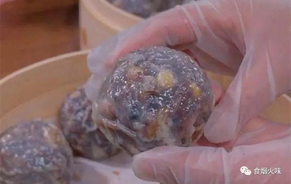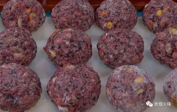 4.用手将处理好的食材,取出适量放在手心上,用手用力抓紧,将其捏成一个团状,就像下图这种状态。只要能捏成团就可以,所以一开始加入的糯米粉不需要很多;