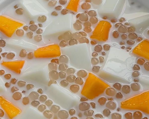 将芒果切丁与煮好的西米、椰奶一起放入碗中,冷藏后食用,冰凉爽滑,夏天必备!