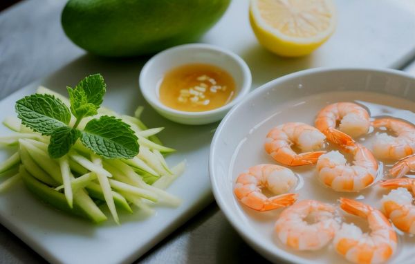 所需食材:1个青芒果、10只鲜虾仁、少许薄荷叶。