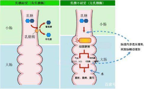 乳糖不耐受是由于小肠刷状缘乳糖酶缺乏或活力减低,不能将奶或奶制品中的乳糖分解为单糖吸收,而产生腹痛,腹胀,腹泻,产气增多等症状。