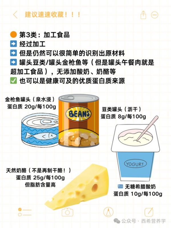 例如:罐头豆类、罐头金枪鱼、传统面包、奶酪等(注意:罐头午餐肉属于超加工食品)。