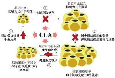 对于减肥的人来说,CLA的重要作用在于能减少脂肪细胞的数量。一般来说,人体内的脂肪细胞数量只会增加、不会减少。普通的减肥方法,只会减小体内的脂肪细胞体积,而难以减少其数量,就像让100个气球泄了气一样。可是,一旦有多余的能量,这些“气球”又会迅速膨胀,令脂肪细胞的体积变大,肥胖和臃肿再度回归。不过,CLA却能减少脂肪细胞的数量,让100个气球变成10个,杜绝减肥中最让人沮丧的“反弹现象”。
