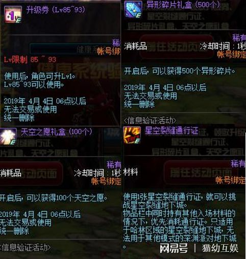 既然都是一个健康认证的活动了,所以有活动就肯定有奖励,不然也不是所有人都会白白的去验证一下的。认证以后会赠送两张85~93的升级券,可以让大家在升级路上节省很多的时间。8张星空裂缝通行证不算什么好东西,但是说不定就出毕业武器了。500个异形碎片相当于一件哈林史诗的设计图,100个天空之愿等于10个苍穹碎片,蚊子腿奖励啦。