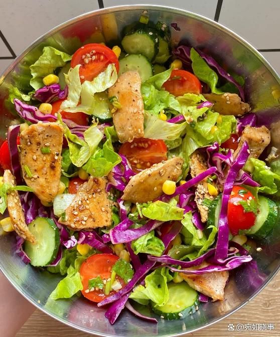 鸡胸肉是一种高蛋白低脂肪的食材,与新鲜的蔬菜沙拉一起搭配,用橄榄油或低热量沙拉酱作为调味料,不仅营养均衡,而且热量控制得也不错。