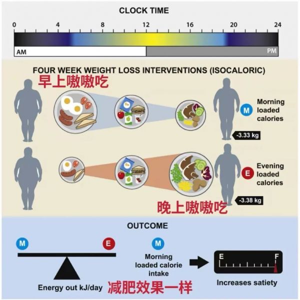 科学家做了一个实验,邀请参与者分别进行了 2 次为期 4 周的减肥。他们每天的能量摄入总数相同,一组「早上嗷嗷吃」、另一组「晚上嗷嗷吃」。