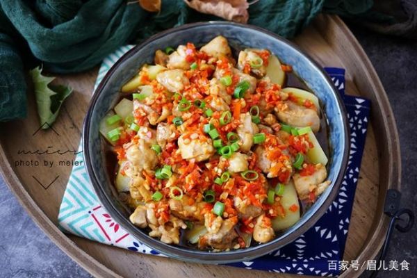5、腌好的鸡腿肉放在土豆上面,再加上3~4汤匙的剁椒,几片姜片,浇上2汤匙植物油。