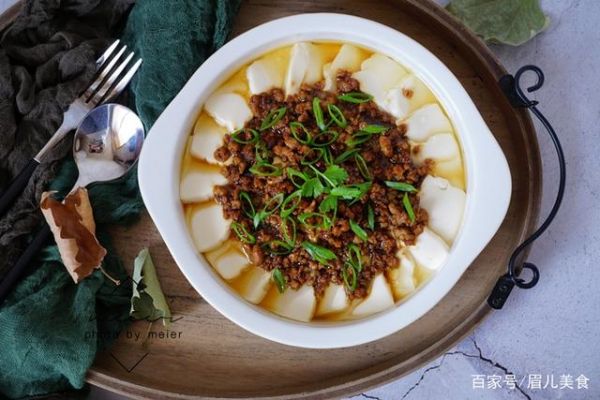 5、将豆腐整齐地码在盘子中,炒好的肉末浇在上面。
