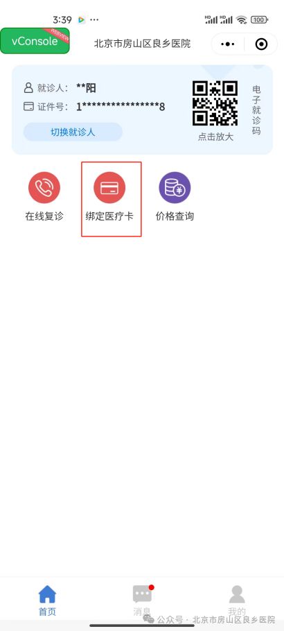 步骤一:进入小程序,注册并登录后,在首页点击(绑定医疗卡进行身份认证,如果您是首次使用小程序,进入绑卡页面后,需要先创建一个成员再进行绑卡。