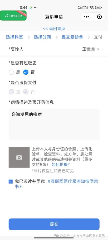 步骤四:选择复诊人、是否有过敏药物及填写病情描述等相关资料,点击提交。