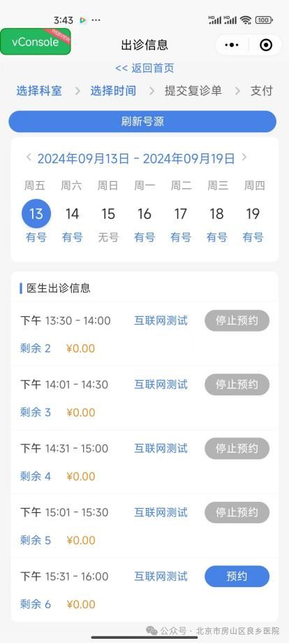 步骤三:根据您的病情和时间,选择科室、医生和号源时段,点击预约。