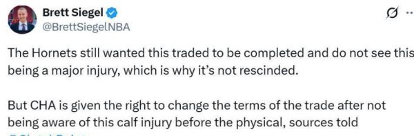 根据联盟多位随队记者的报道,黄蜂队在完成体检之前,对于怀特的这笔伤情完全不知情。在公牛队提供的球员健康信息中,可能并未重点标注这一情况,或者该伤情是在最近一两场比赛中新出现的。这一突发状况触发了NBA交易协议中的保护条款。