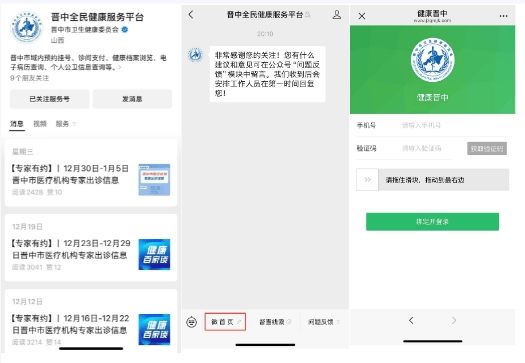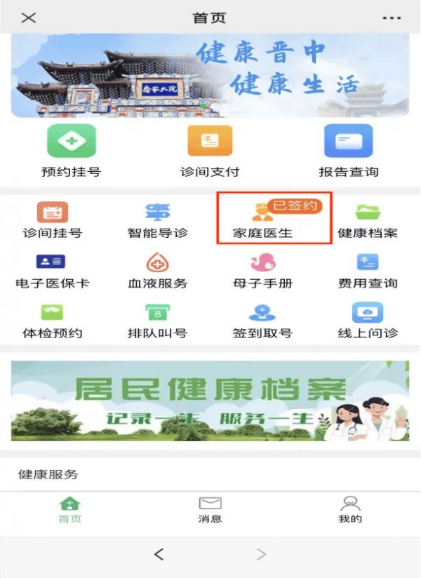 第一步:关注手机微信公众号“晋中全民健康服务平台”,关注后点击菜单栏中“微首页”,进行手机号绑定注册。