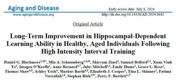 2024年7月8日,澳大利亚昆士兰大学的研究人员在"Aging and Disease "期刊上发表了一篇题为" Long-Term Improvement in Hippocampal-Dependent Learning Ability in Healthy,Aged Individuals Following High Intensity Interval Training "的研究论文。