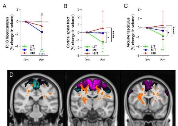 在这项随机对照研究中,研究人员分析了151名参与者,年龄在65-85岁之间,且没有认知障碍,按1:1:1的比例随机分为三组,低强度(LIT)、中强度(MIT)和高强度间歇训练(HIIT),每月进行一次海马体表现的认知测试和血液采集,分析了三种运动强度对大脑的影响。