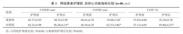 护理后,两组的LVEDD、LVESD均降低,LVEF均升高,且观察组优于对照组(P<0.05,表1)。