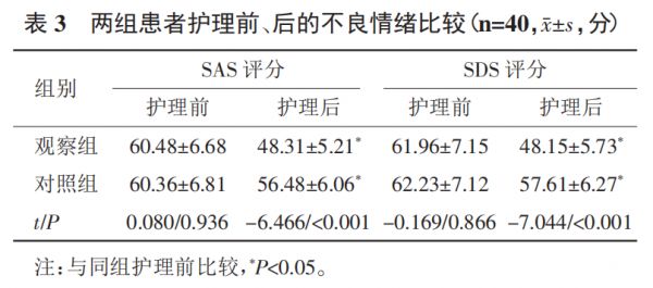 护理后,两组的SAS、SDS评分均降低,且观察组低于对照组(P<0.05,表3)。