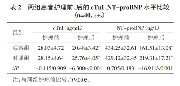 护理后,两组的cTnI、NT-proBNP水平均降低,且观察组低于对照组(P<0.05,表2)。